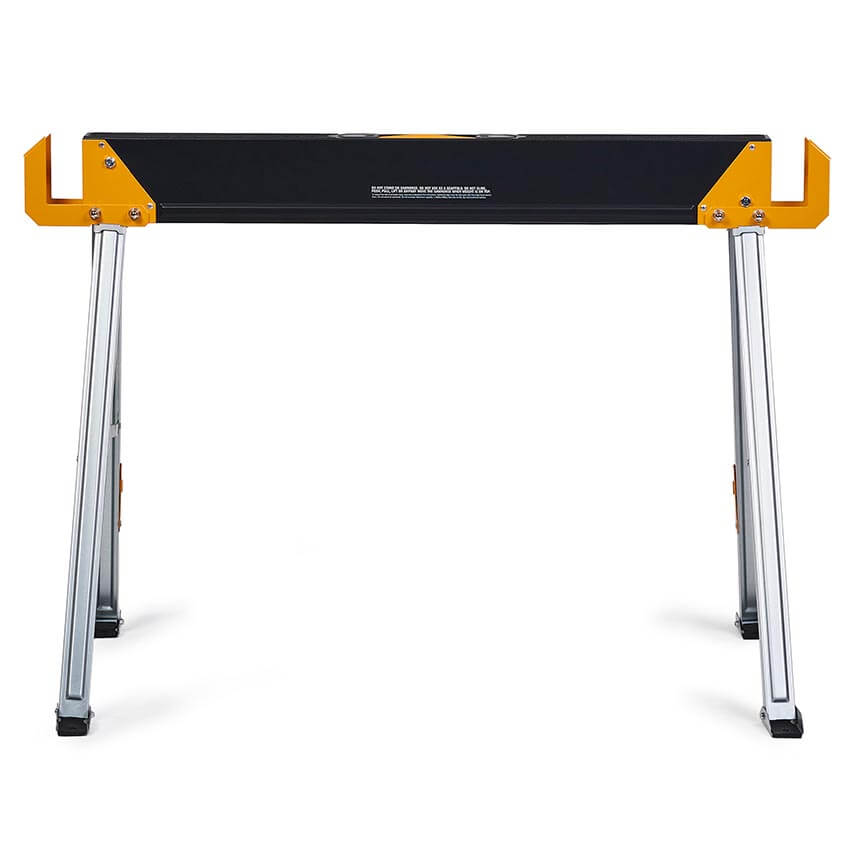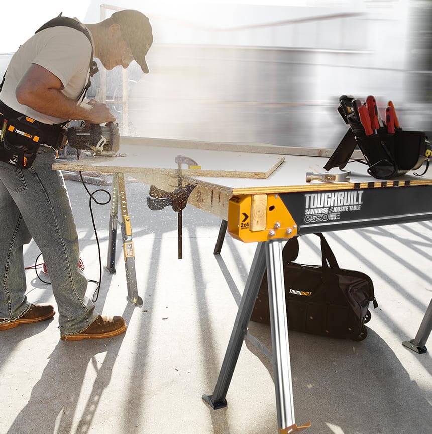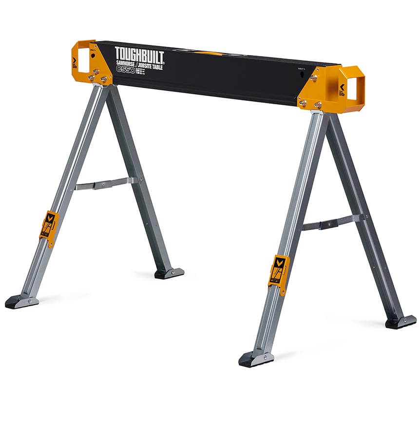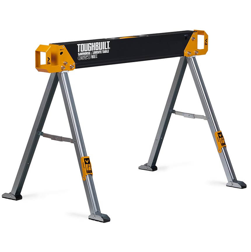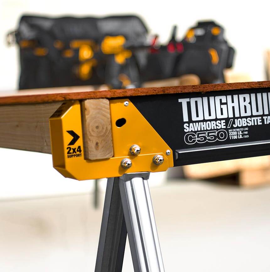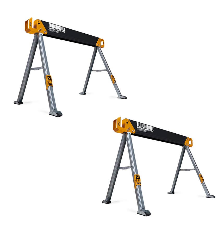 ToughBuilt-ov paket dveh trpežnih in robustnih mizarskih stolic, izdelanih iz 100% visoko kakovostnega jekla, z izjemno zmogljivostjo – ena stolica vzdrži 498 kg, v paru pa kar 998 kg. S podpornimi nogami 2×4, ki se združijo v trdno delovno mizo.