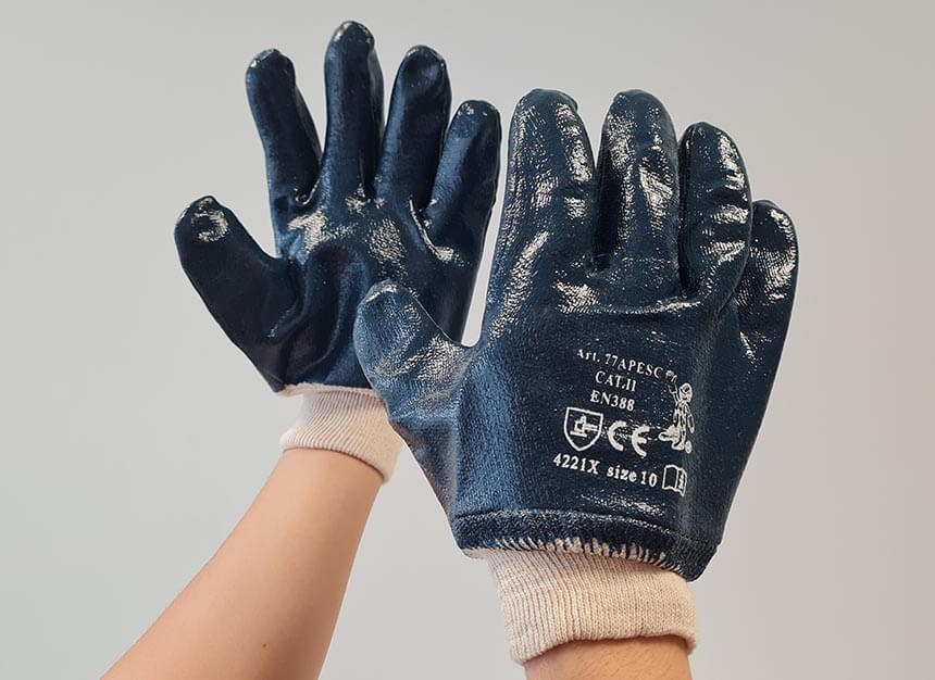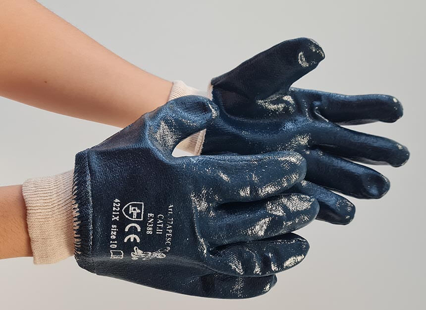 Modre bombažne rokavice, ki so popolnoma prekrite z nitrilom za odličen oprijem in udobje ter imajo elastično belo pletenino na zapestju.