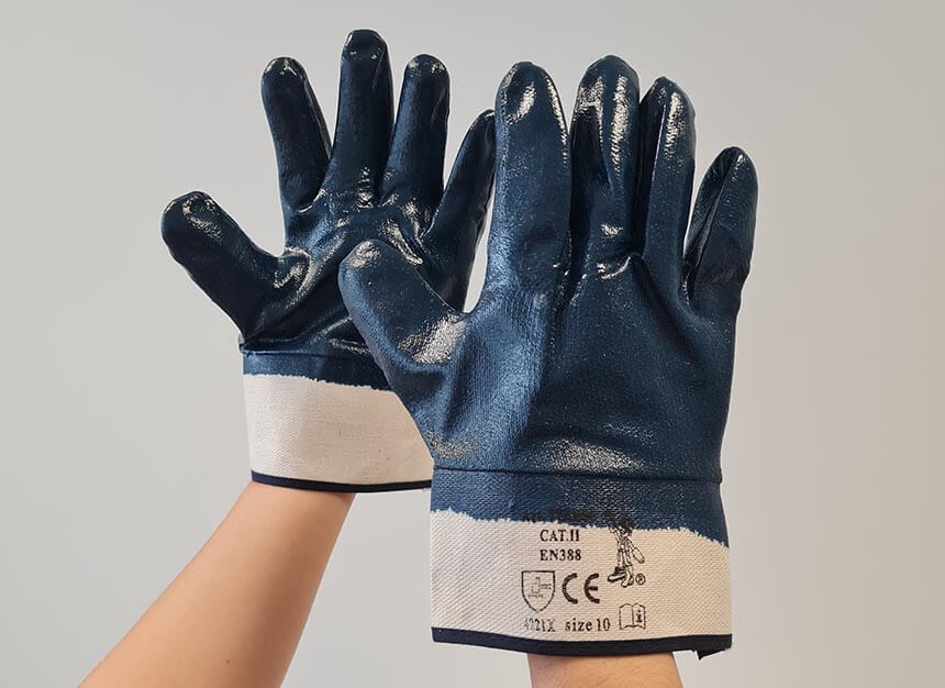 Modre bombažne rokavice popolnoma prevlečene z nitrilom za odličen oprijem in udobje, z belo platneno manšeto.