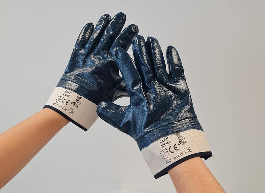 Popolnoma z nitrilom prevlečene bombažne delovne rokavice z manšeto