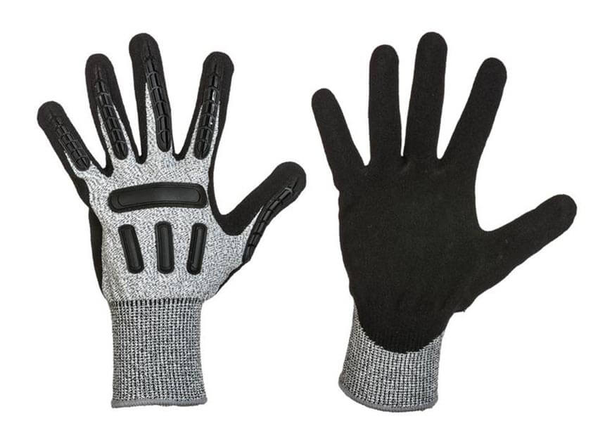 Prevlečene z nitrilom, z zaščito pred udarci na zadnji strani dlani ter peščeni zaključek na sprednji strani dlani. Na zapestju je elastična pletena manšeta v sivi barvi.