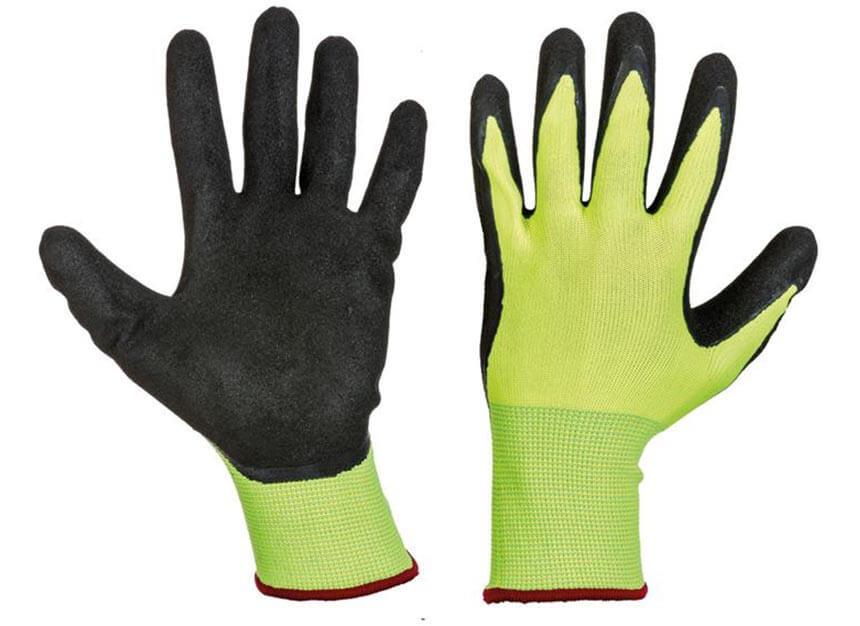 Rumeno črne brezšivne najlonske rokavice. Na dlani in prstih so prekrite s satenasto nitrilnim premazom, ki omogoča močan oprijem. Imajo elastično manšeto iz pletenine, zadnji del je zračen.