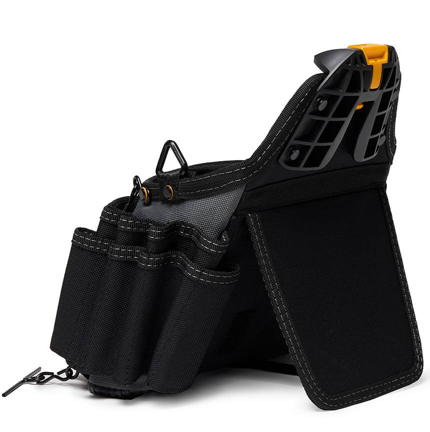 Torbica se pripne na vsak pas in z njega, ClipTech™ zaponka je vključena, nedrseča podložena naramnica, nastavljivo držalo za svetilko, 25 žepov in zank, prilagodljivi trakovi, robustna konstrukcija, sponka za merilni trak. Torbico in orodje postavite na stojalo na tla ali mizo poleg sebe.